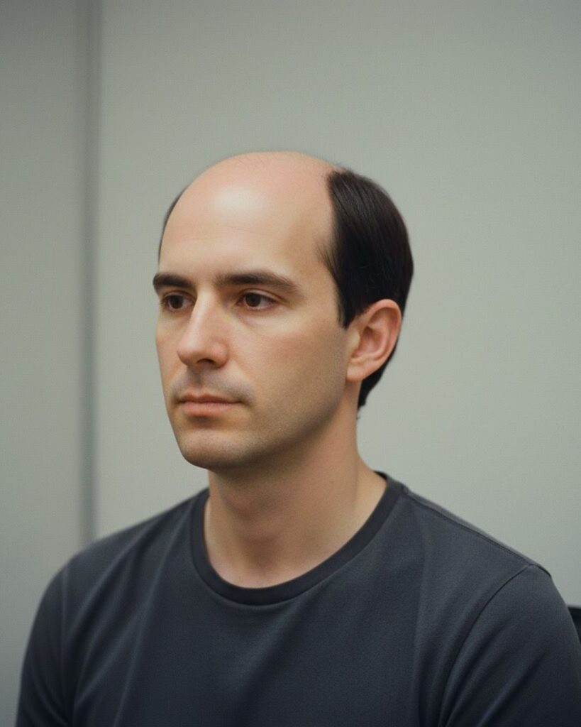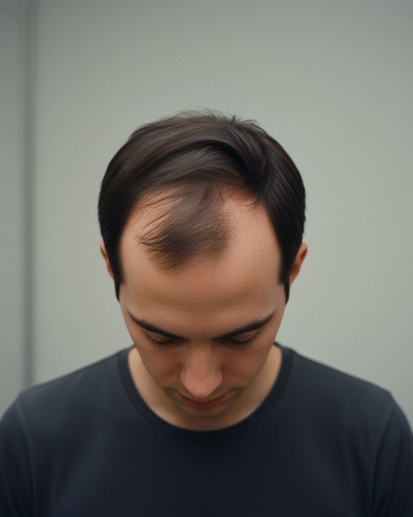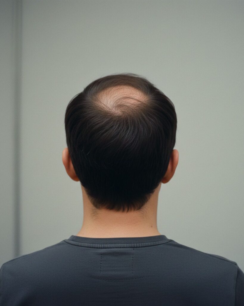 Diagnóstico: Buen cabello en el frente, pero pérdida de densidad circular en la parte posterior superior.